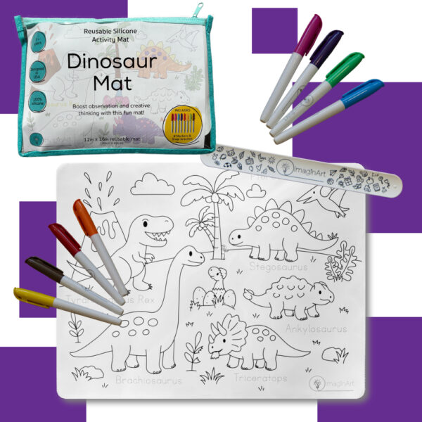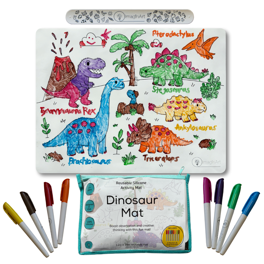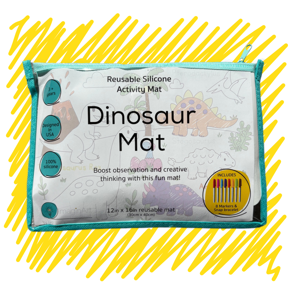 Our Dinosaur Mat Kit comes with a double-sided reusable silicone mat and everything your little one needs for adventurous, mess-free fun on the go.