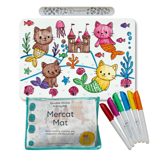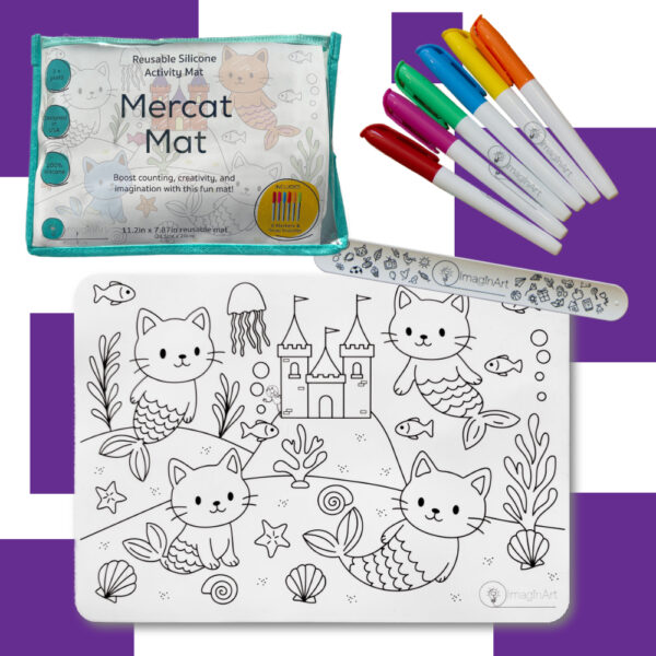 Our Mercat Mat Kit comes with a double-sided reusable silicone mat and everything your little one needs for imaginative, mess-free fun on the go.