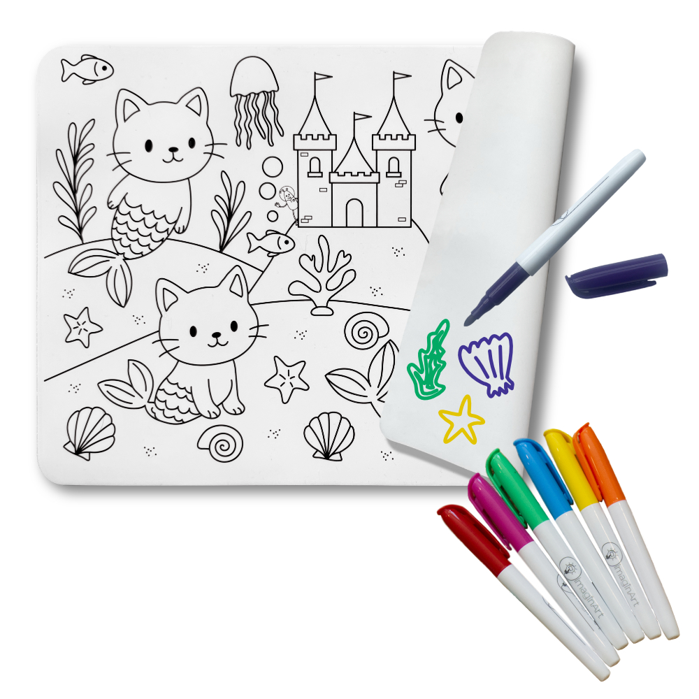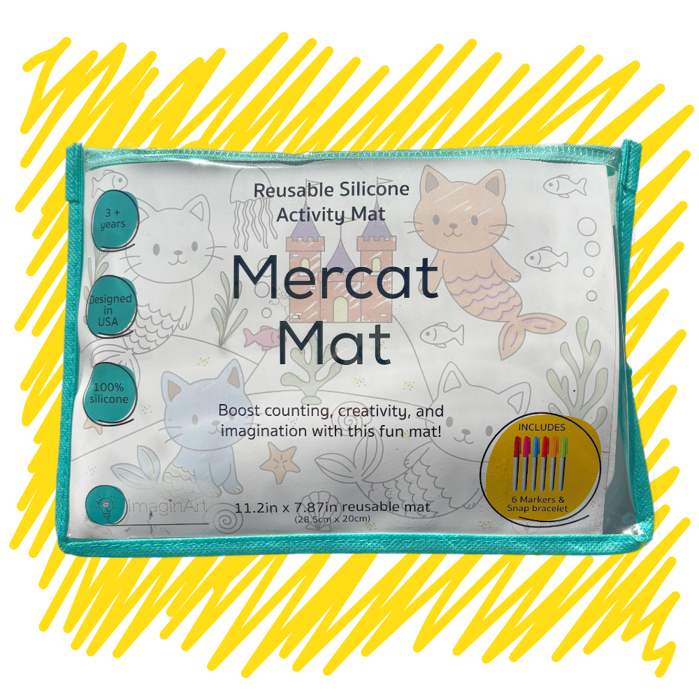 Our Mercat Mat Kit comes with a double-sided reusable silicone mat and everything your little one needs for imaginative, mess-free fun on the go.